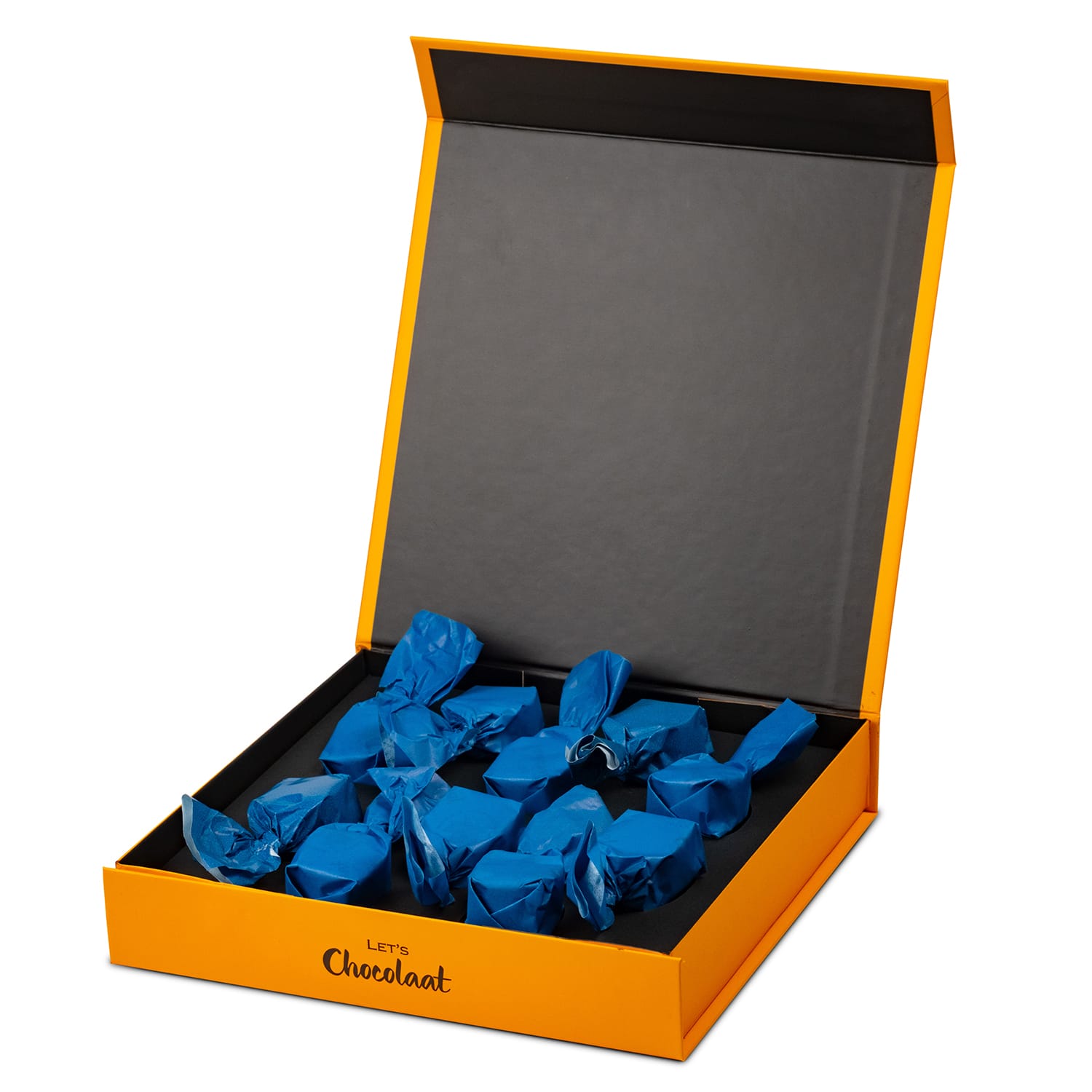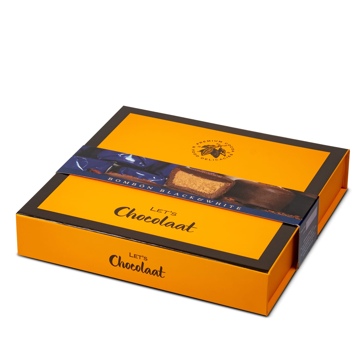 Outside: Dark chocolate coating (sugar, cocoa butter, cocoa mass, emulsifier: soy lecithin, vanilla flavor, minimum cocoa 55%), milk chocolate (sugar, cocoa butter, whole milk powder, cocoa mass, emulsifier: soy lecithin, natural vanilla flavor, minimum cocoa 30%).