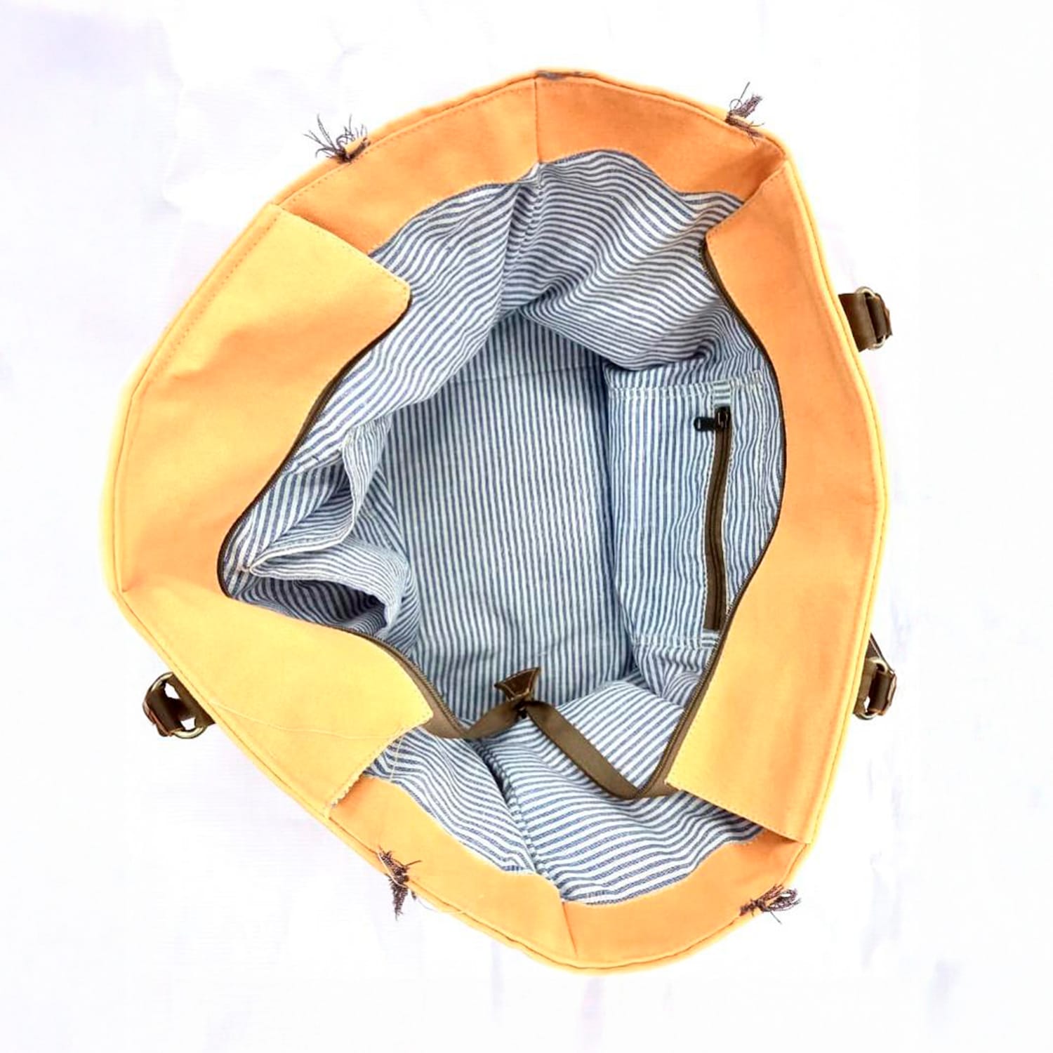 This Tote bag is made of heavy-duty reclaimed canvas, with brown leather handles for a vintage look.